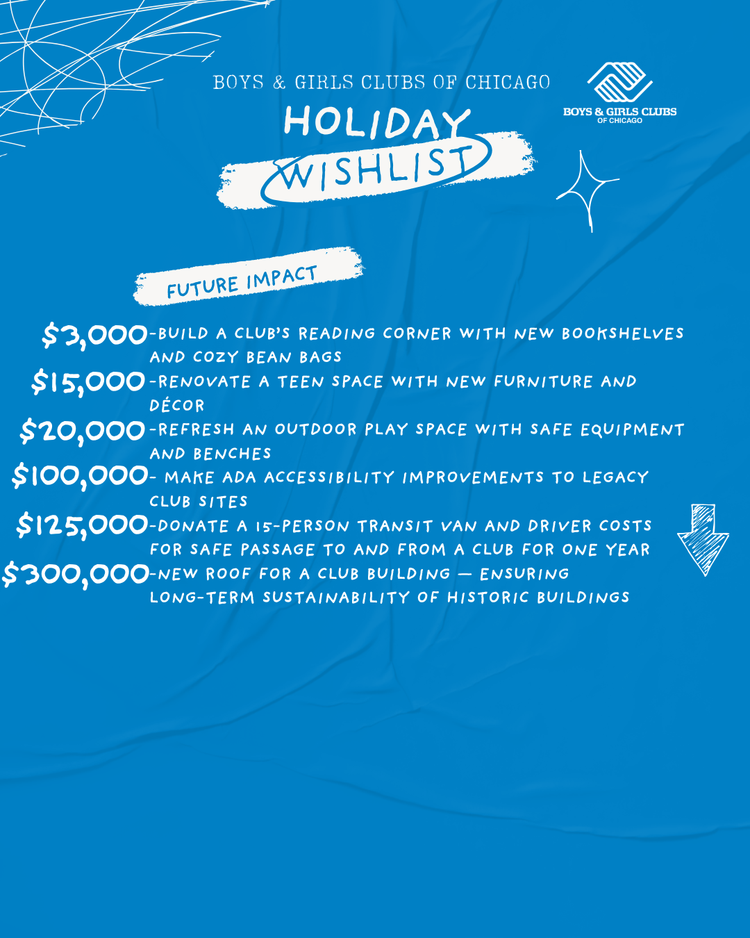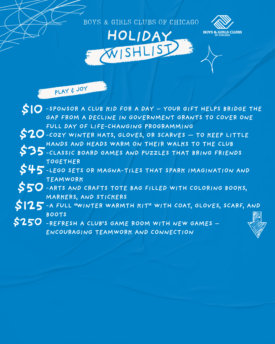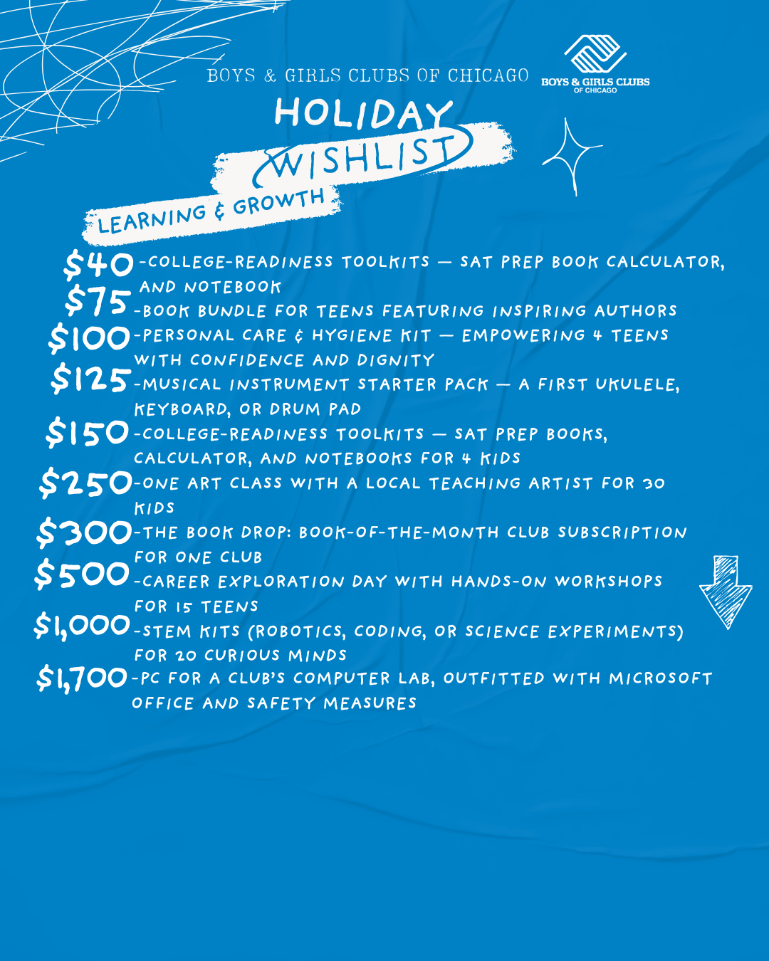 Every child deserves joy, safety, and opportunities this holiday season. With your support, Boys & Girls Clubs of Chicago can make our Holiday Wishlist a reality — from warm winter coats to a college tour, from art supplies to a safe and inspiring Club.
